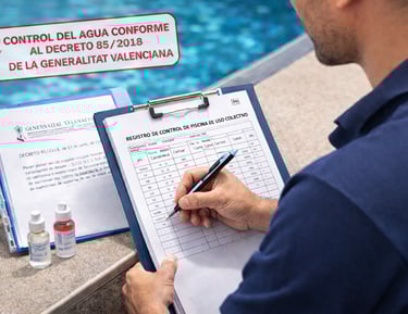 Control del agua conforme al Decreto 85/2018 de la Generalitat Valenciana, manteniendo registros y parámetros dentro de los valores exigidos para piscinas de uso colectivo.